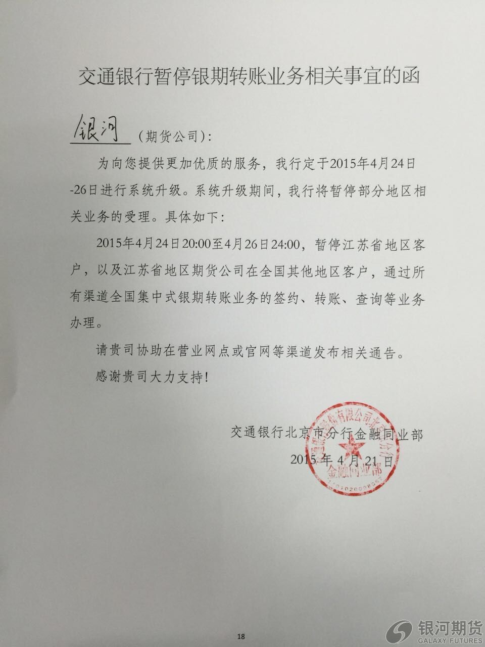 關(guān)于交通銀行暫停銀期轉(zhuǎn)賬業(yè)務(wù)的通知(4月24日20:00到4月26日24:00)