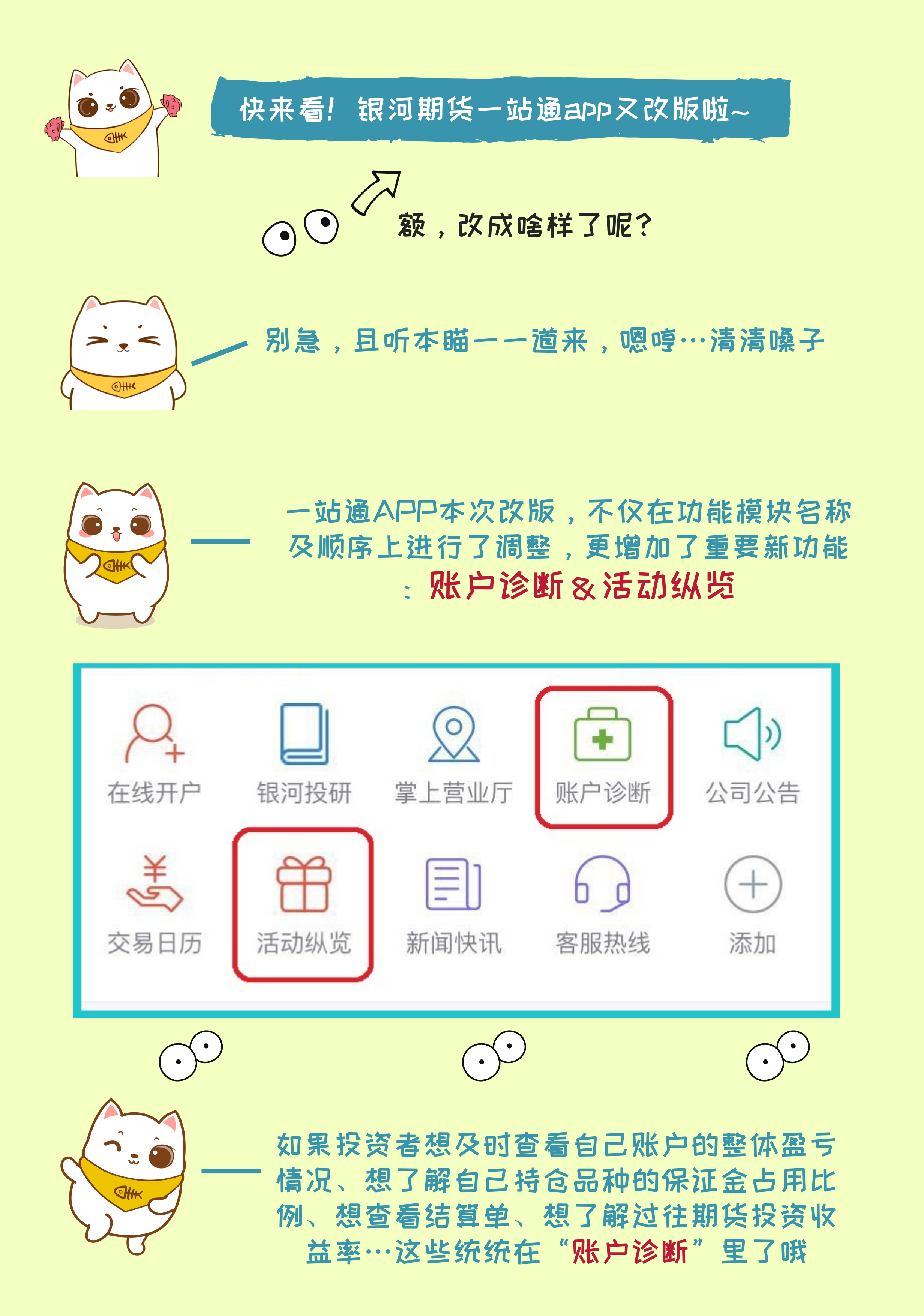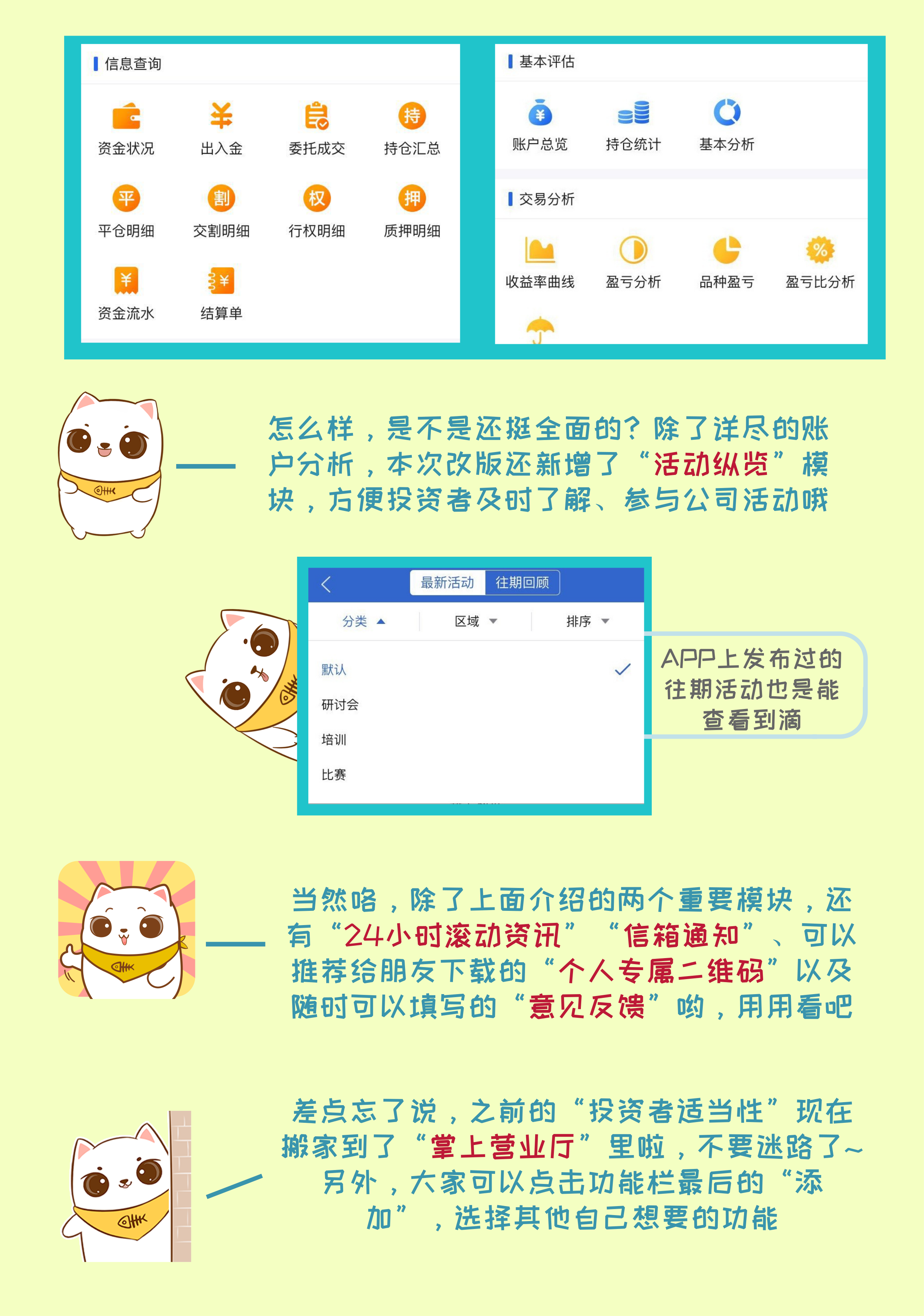 本次一站通改版不僅對(duì)界面布局、模塊次序進(jìn)行了調(diào)整優(yōu)化,還增加了投資者賬戶診斷、活動(dòng)瀏覽報(bào)名、24小時(shí)新聞快訊、意見(jiàn)反饋、專屬二維碼推薦等功能,以幫助投資者更加便捷地使用移動(dòng)軟件工具進(jìn)行投資操作。