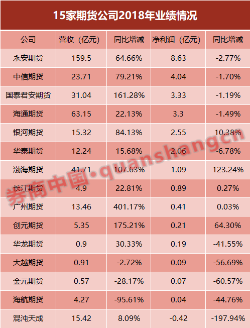 據(jù)券商中國記者統(tǒng)計(jì),2018年,共有永安期貨、中信期貨、國泰君安期貨、海通期貨、銀河期貨以及華泰期貨等6家期貨公司的凈利潤超過2億元,合計(jì)達(dá)23.91億元。